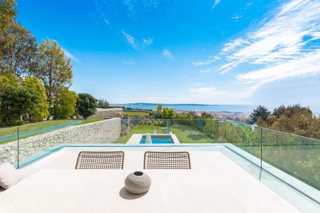 Golfe Juan, located in a residential area in the hills, this contemporary villa boasts stunning architecture and panoramic sea views from Cap d'Antibes to the Îles de Lérins.