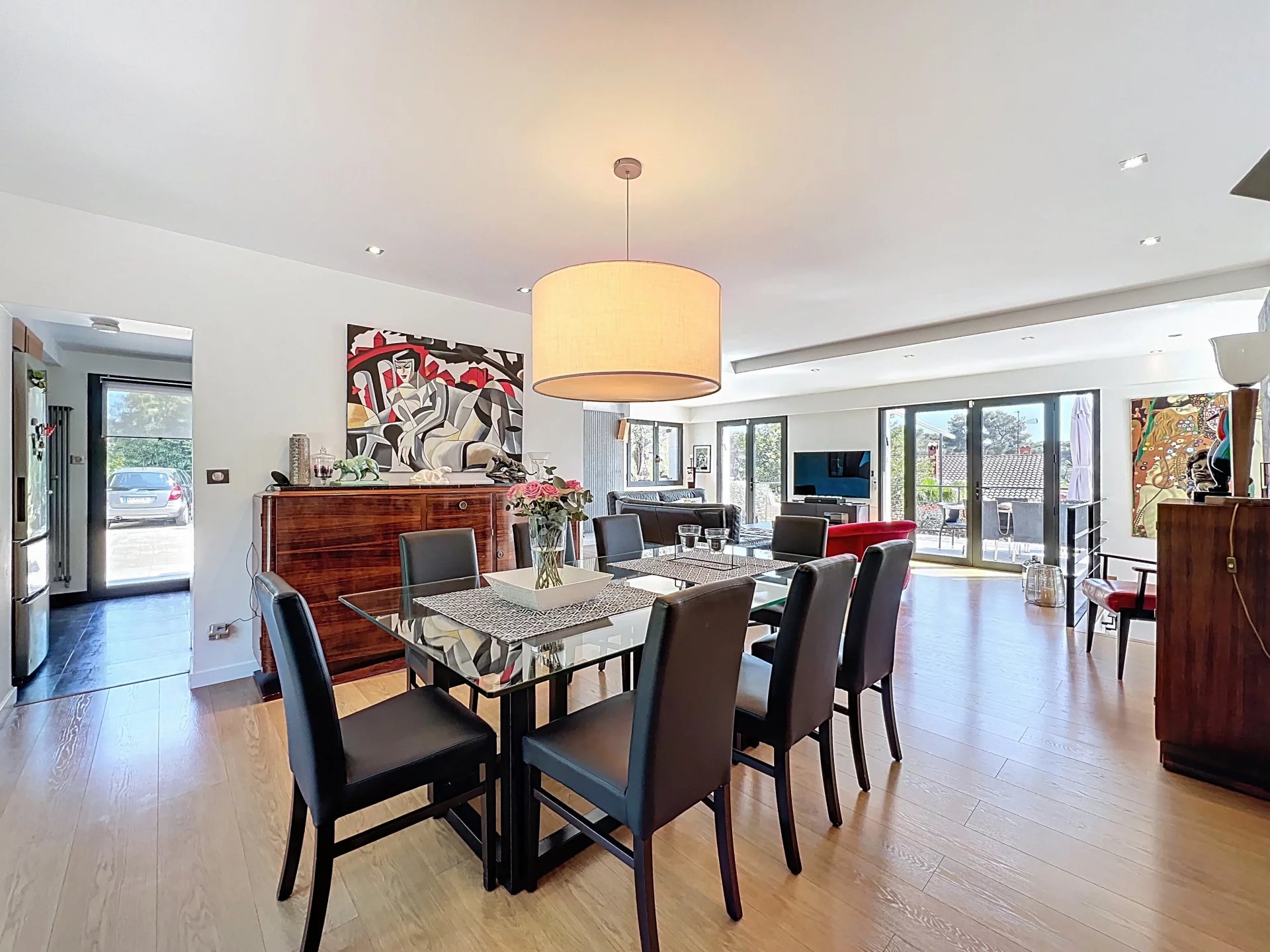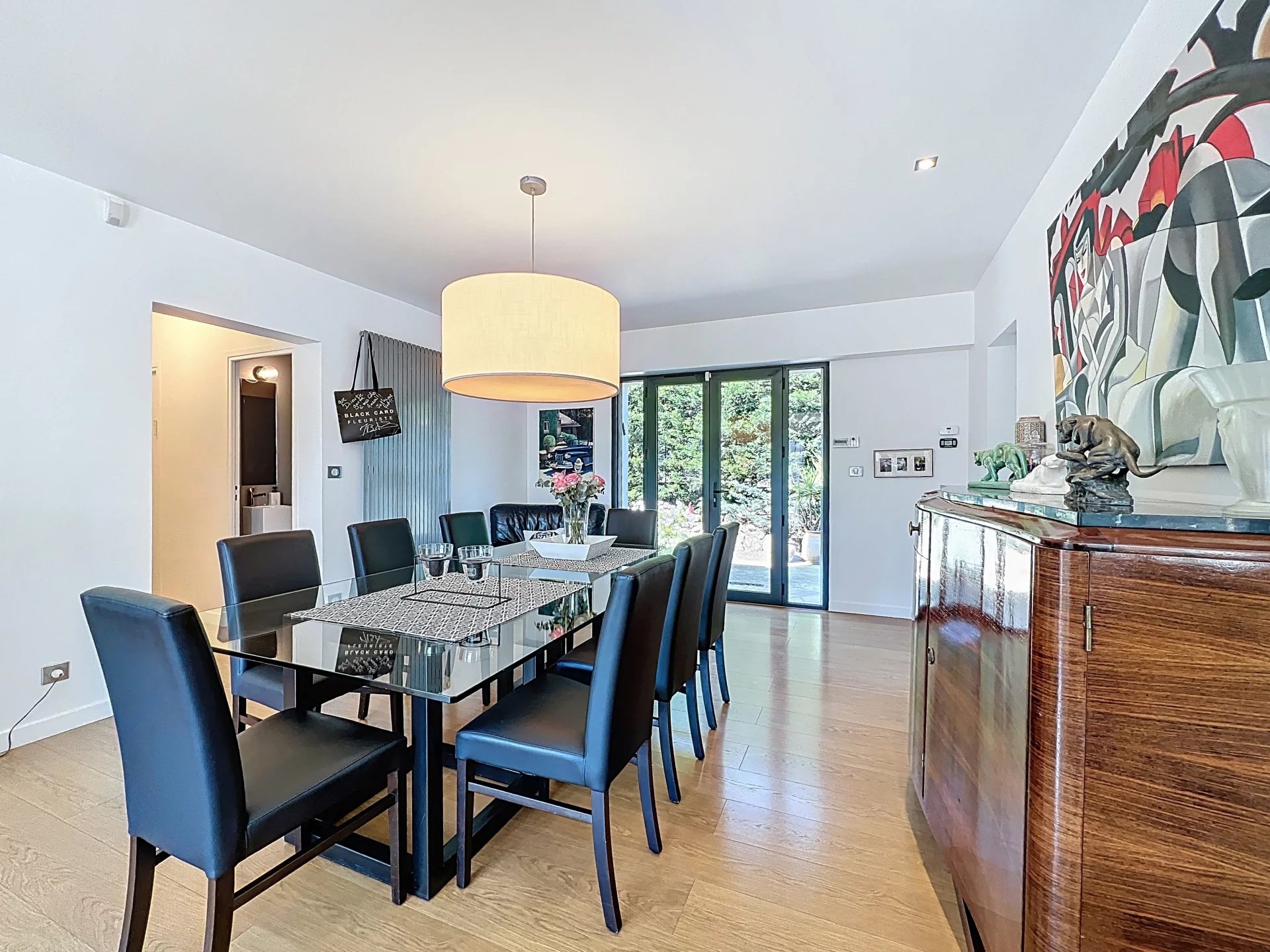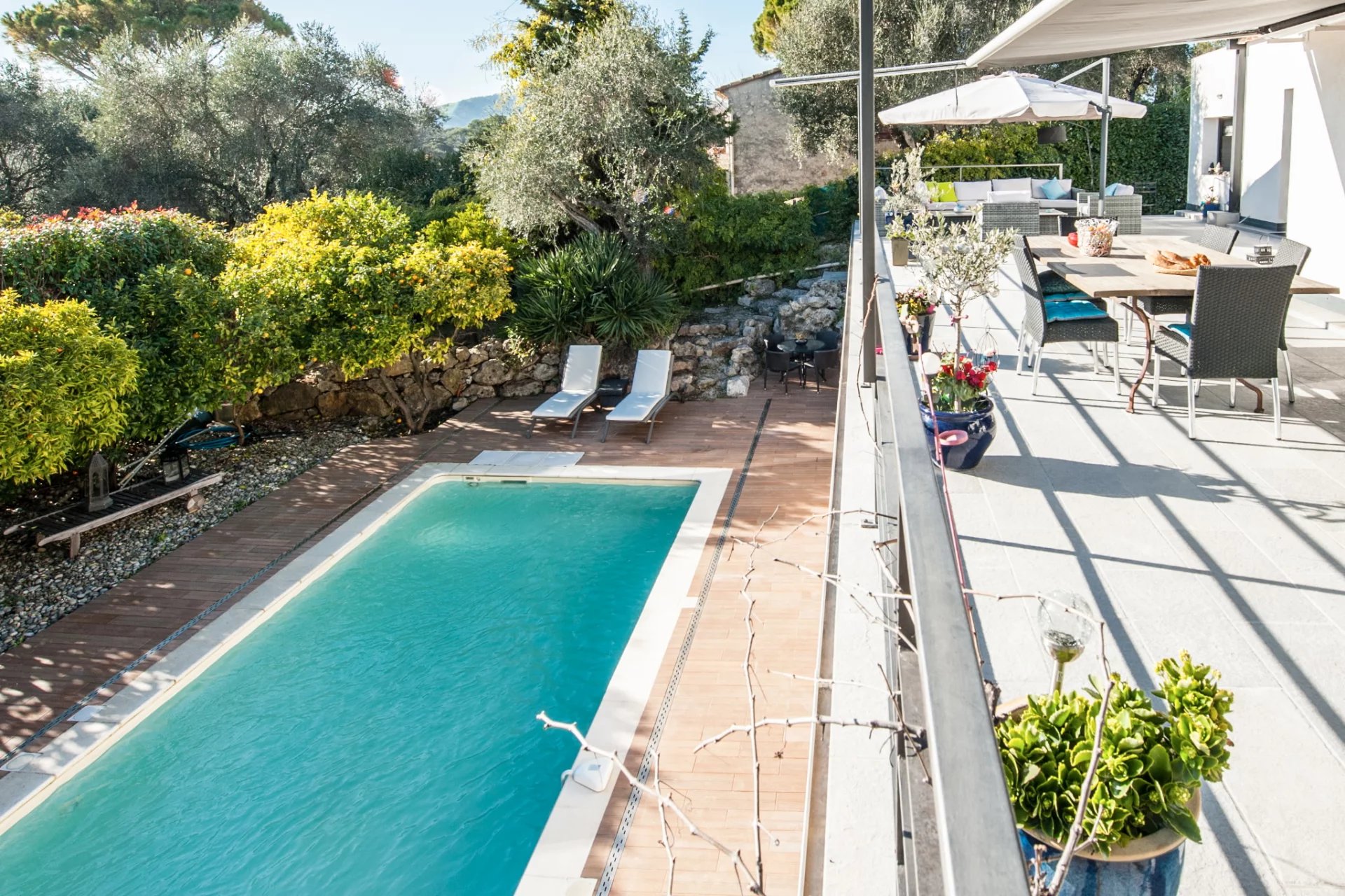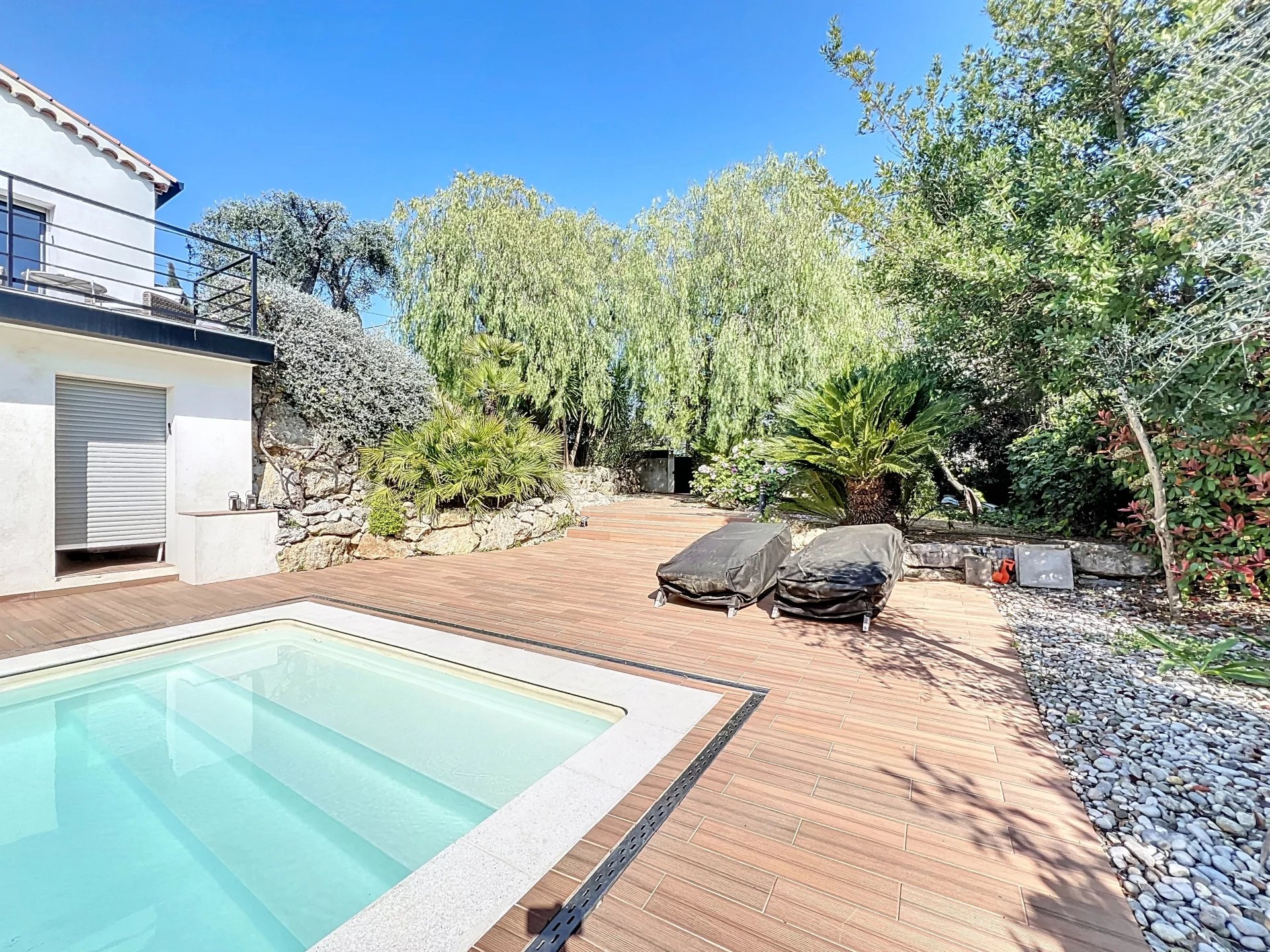 Set in a peaceful and green environment, this stunning 185 m² two-level villa has been tastefully renovated throughout. It is nestled on a beautiful, tree-lined plot featuring fruit trees (orange, lemon, grapefruit) and boasts a large 10 x 3.5 m swimming pool.