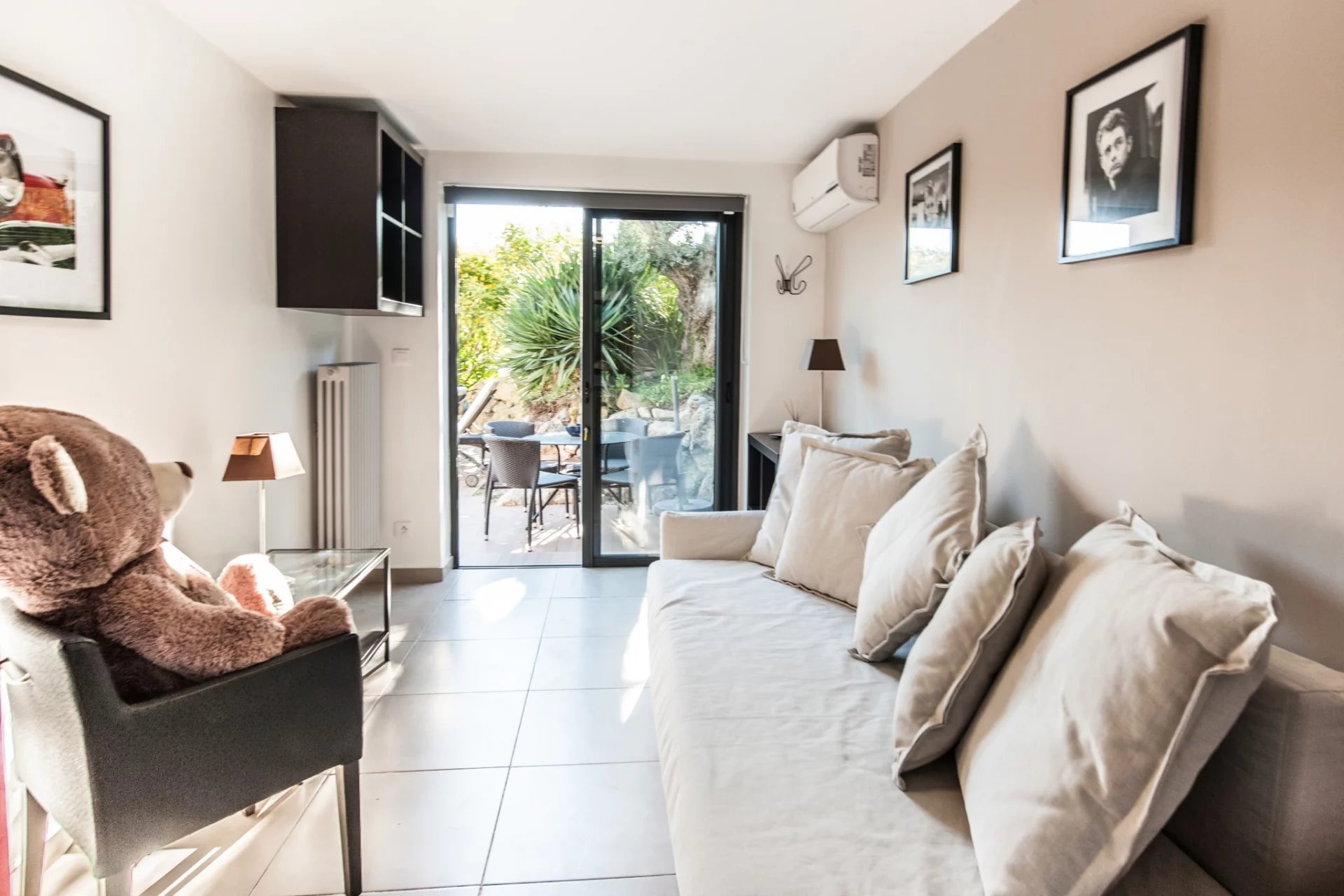 On the lower level, there are two en-suite bedrooms, each with its own shower room, a separate toilet, and an independent studio-style bedroom with a private shower room and WC. All bedrooms open directly onto the garden, creating a calm and natural atmosphere.