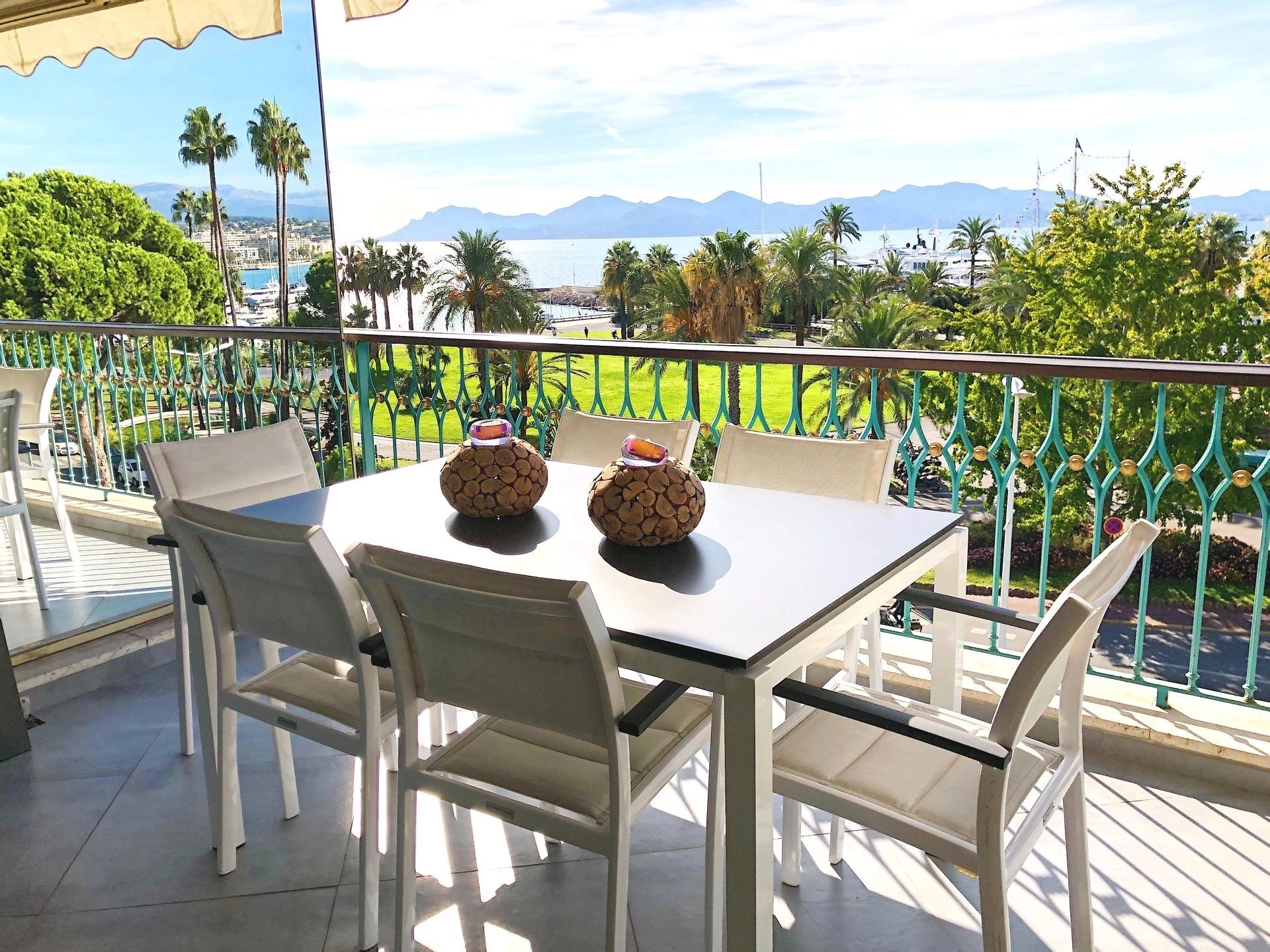 Situated on La Croisette facing Port Canto, in a high-ranked residence; magnificent fully renovated 2 bedroom apartment of 105 sqm on a high floor, offering panoramic views over the sea and the port. The apartment features an entrance-hall, a vast living-room with lounge and dining-area opening onto the terrace facing the sea, an open kitchen with kitchen island, a Master bedroom with double bed 1.80, shower-room, toilet and dressing. A 2nd bedroom with pull-out bed (0.80+0.80=1.60), shower-room, and a separate toilet. A/C, internet access.