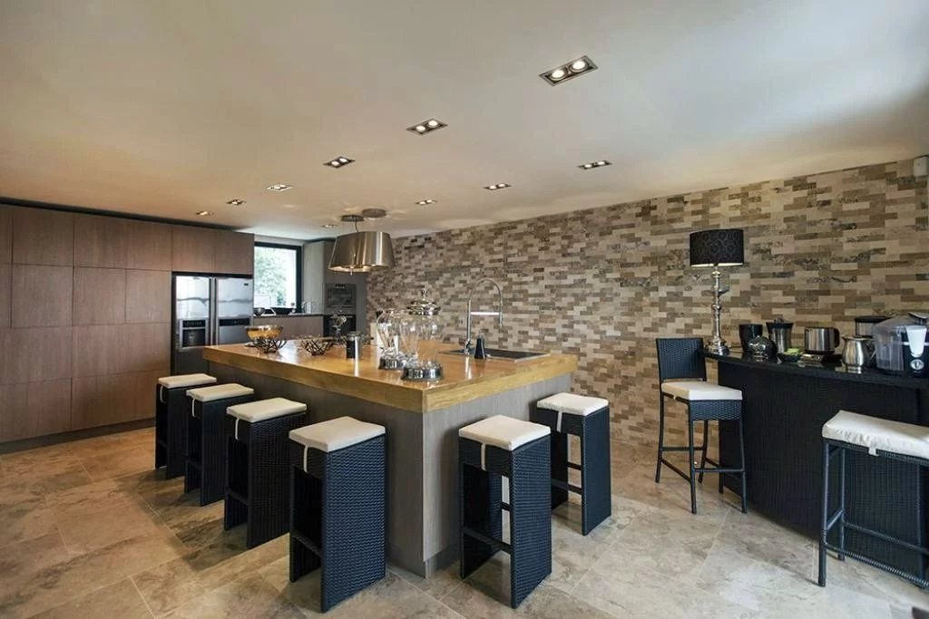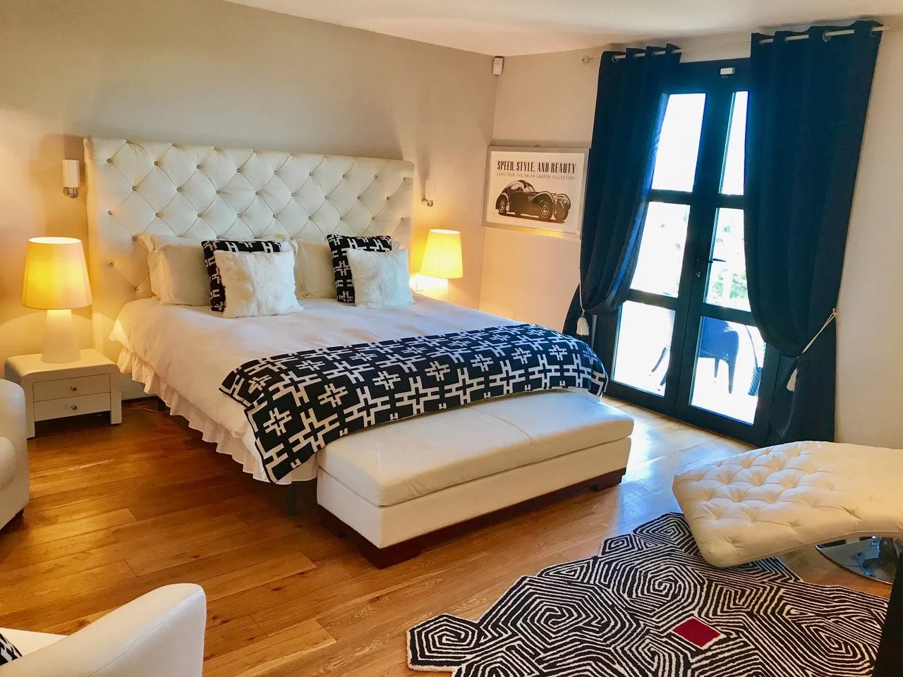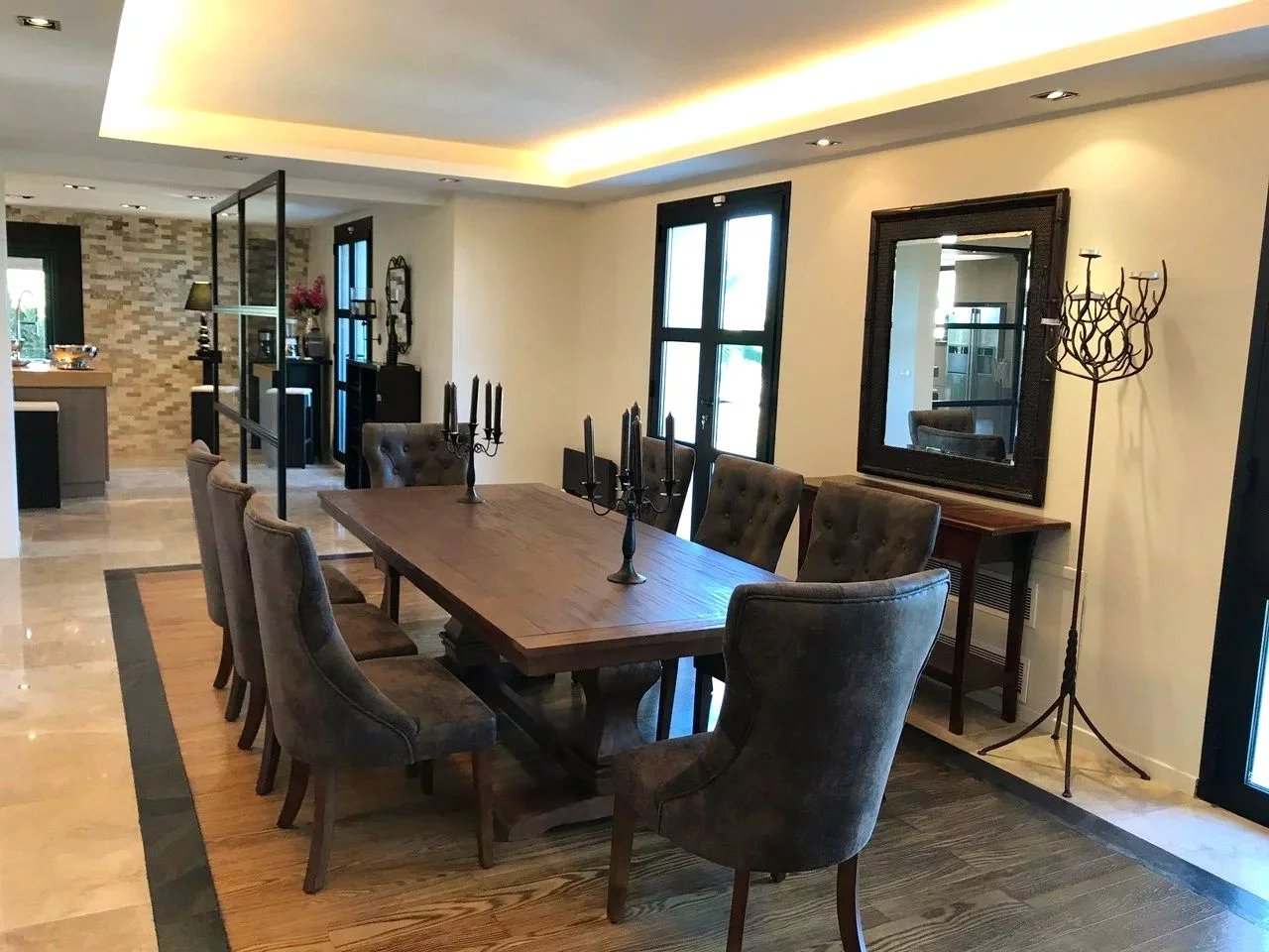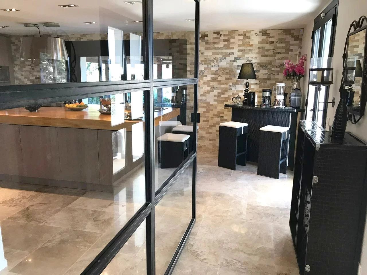 It features on the bottom floor; a vast entrance-hall, a living-room opening onto the terrace and the pool, a dining/ meetingroom , a vast kitchen with bar and dining area, one bedroom with a shower-room.