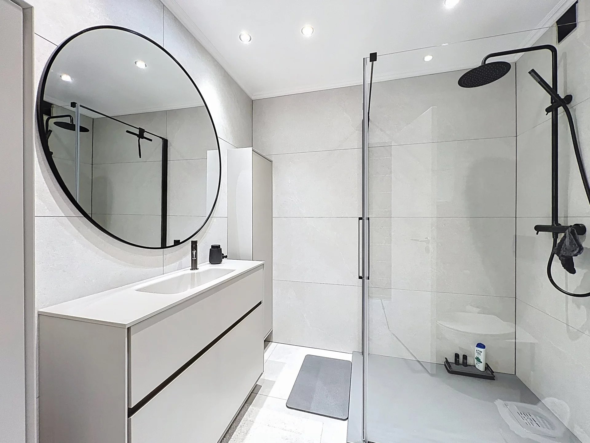 Ce 3 - 4 pièces de 97 m² comprend un vaste séjour avec cuisine ouvert une belle terrasse dans la verdure, une chambre (lit double) et sa salle de douche / wc, une chambre (2 lits simples) et sa salle de douche / wc, une chambre enfant avec lits superposés.