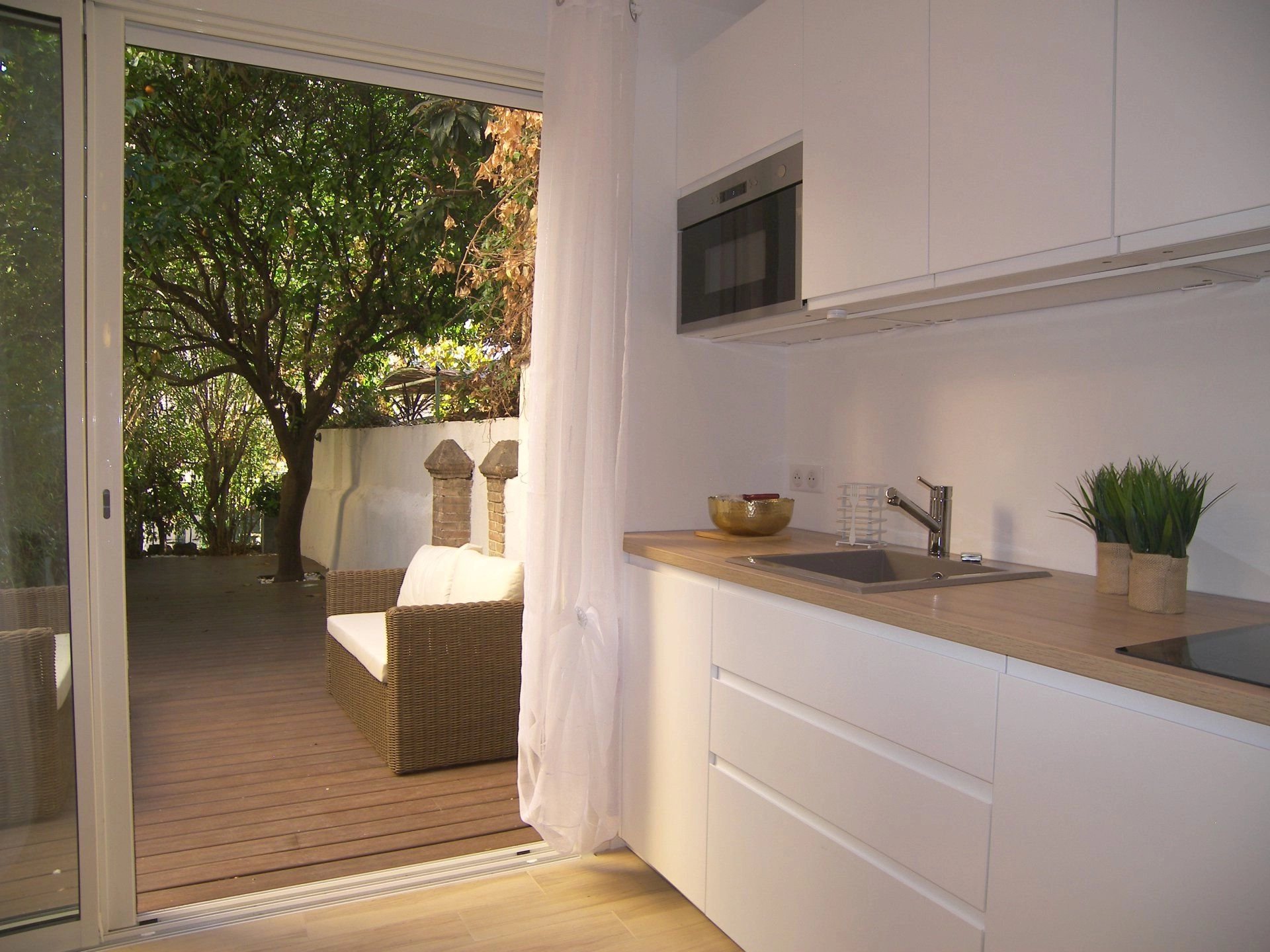 Cannes La Banane - à 2 min de La Croisette et à 7 min du Palais, charmant 2 pièces en rez-de-jardin, entièrement rénové et bénéficiant d'une superbe terrasse de 60m² dans la verdure. L'appartement est composé d'une véranda avec cuisine équipée, un salon TV avec canapé convertible, une salle de douche avec toilettes, ainsi qu'une chambre avec un lit double (1.40).