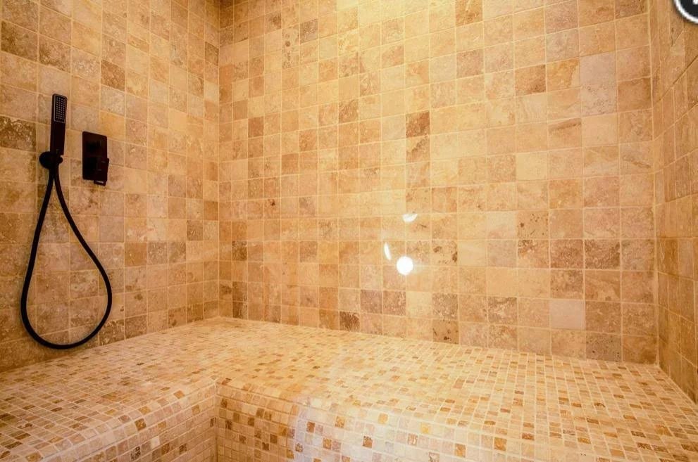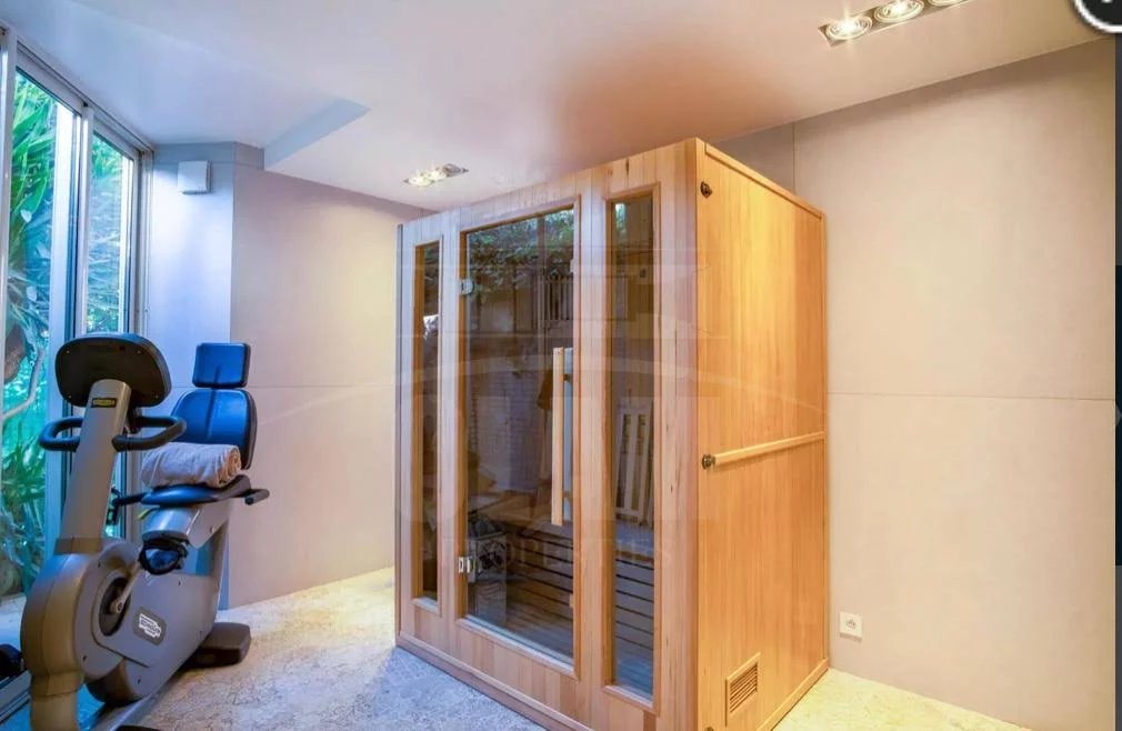 L’espace extérieur dispose d’une piscine, d’une cuisine d’été avec coin repas, d’un sauna, d’un hammam, ainsi que quelques équipements sportifs.
