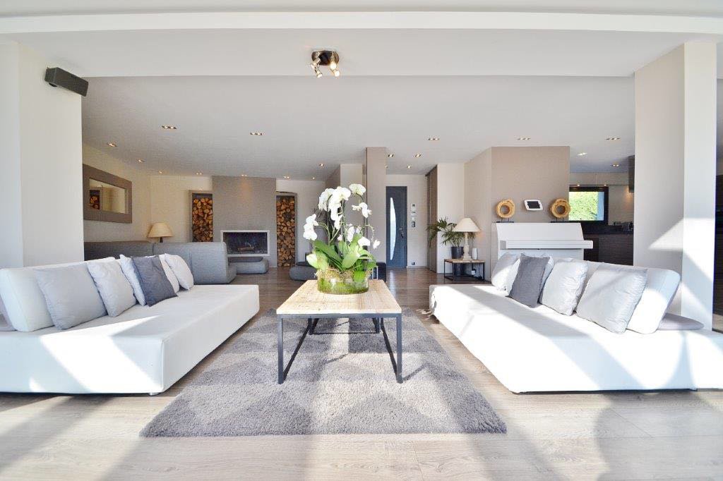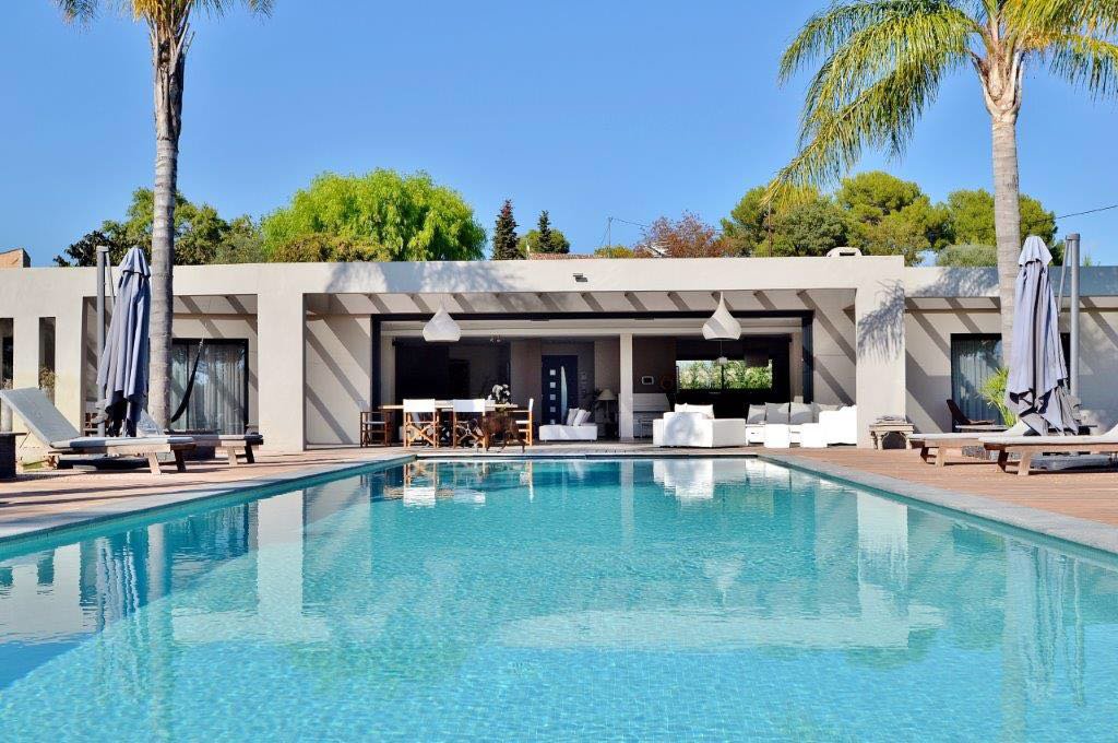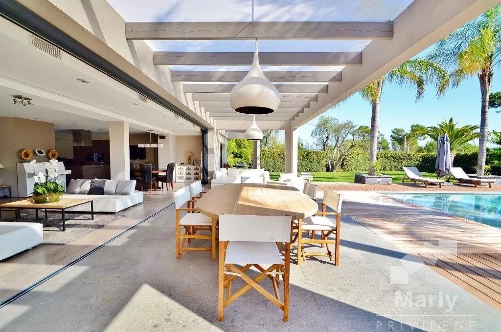 Séjour de 100m2 avec baie vitrée de 9m s’ouvrant sur une grande terrasse, un jardin arboré et une piscine chauffée de 5x15m. Belle cuisine ouverte, 5 chambres: