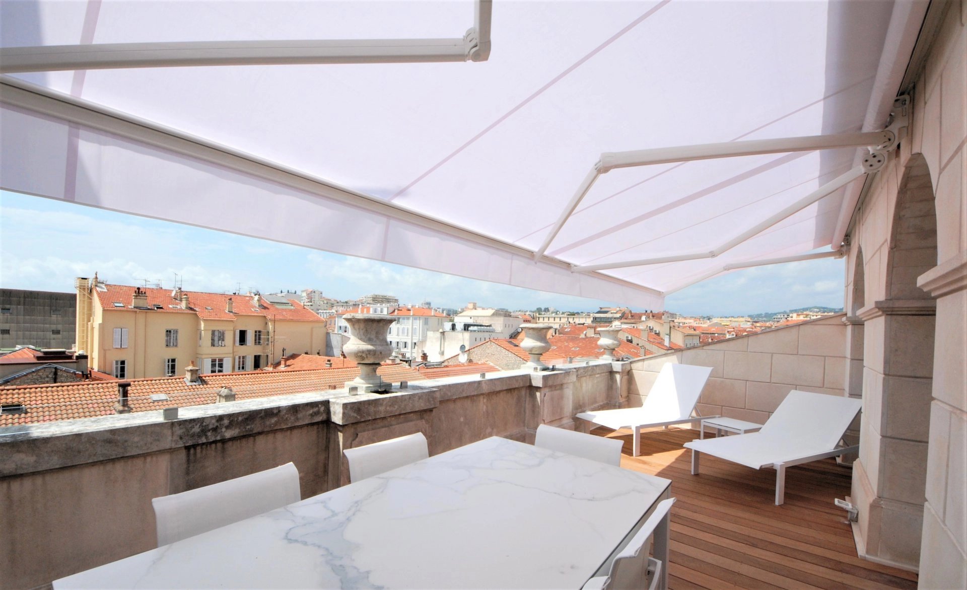 Идеально расположенная в центре города Канны, меньше чем в 250 метрах от Дворца Фестивалей, великолепная квартира дуплекс на последних этажах (5-й и 6-й) буржуазной резиденции, полностью отремонтированная с красивыми высококачественными материалами и оборудованиеи. Эта двухэтажная квартира с 3 спальнями распределена следующим образомю на 5-м этаже, вестибюль, просторная и светлая гостиная с обеденной зоной и полуоткрытой кухней, открытая на прекрасную западную террасу 20 кв.м. из тика с прелеснтым открытым видом на городской пейзаж. Большая мастер спальня (2 односпальных кровати) в сиюте с ванной, гардербной и туалетом.